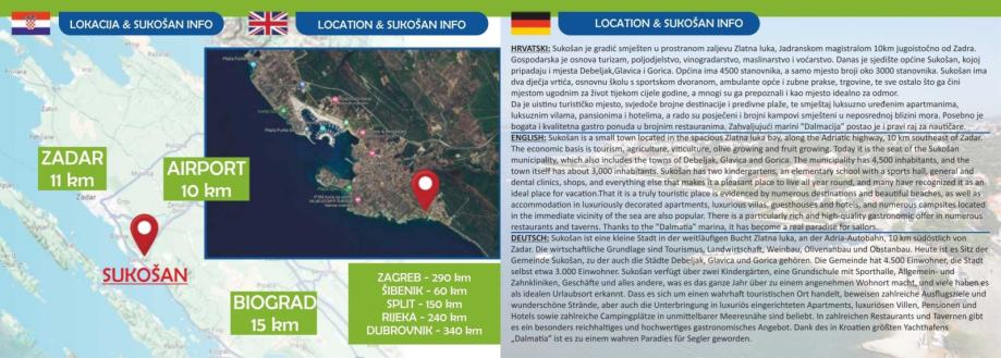 Sukošan se nalazi u prostranom zaljevu Zlatna luka i jedno je od najpoznatijih turističkih mjesta na obali Dalmacije. S bogatom gastro ponudom i najvećom marinom u Hrvatskoj, privlači veliki broj vlasnika luksuznih plovila i nautičara.