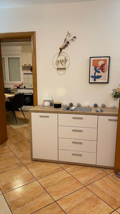 Sveti Filip i Jakov, stan površine 78 m2 s prekrasnim pogledom na more i otoke na 1. katu omanje zgrade s ukupno tri stana. Sastoji se od hodnika, wc i kupaonice, dvije spavaće sobe, kuhinje i blagovaonice, dnevnog boravka i prostrane natkrivene terase s pogledom za ugodne boravke tijekom cijele godine.