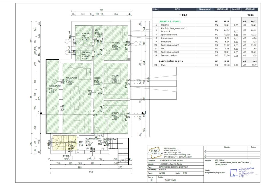 Površina: 88,31 m² + natkriveno parkirno mjesto (2,49 m²), ukupno 90,80 m² neto.