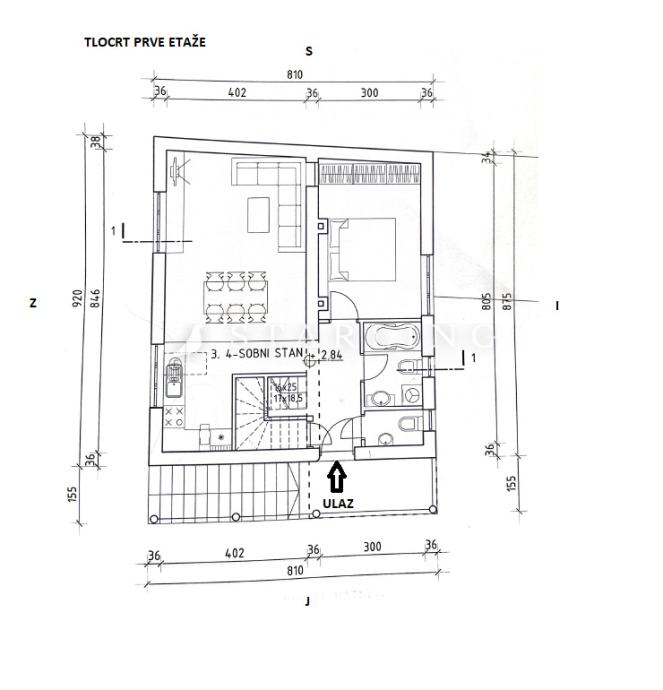 Prodaje se stan neto površine 57 m2 na prvom katu kuće zajedno s tavanskim prostorom ukupne neto površine 62 m2.