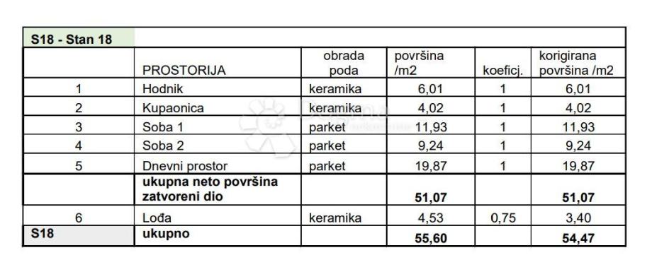 Stan se sastoji od od hodnika, dnevnog boravka s blagavaonicom, 2 spavaće sobe, kupaonice te lođe.