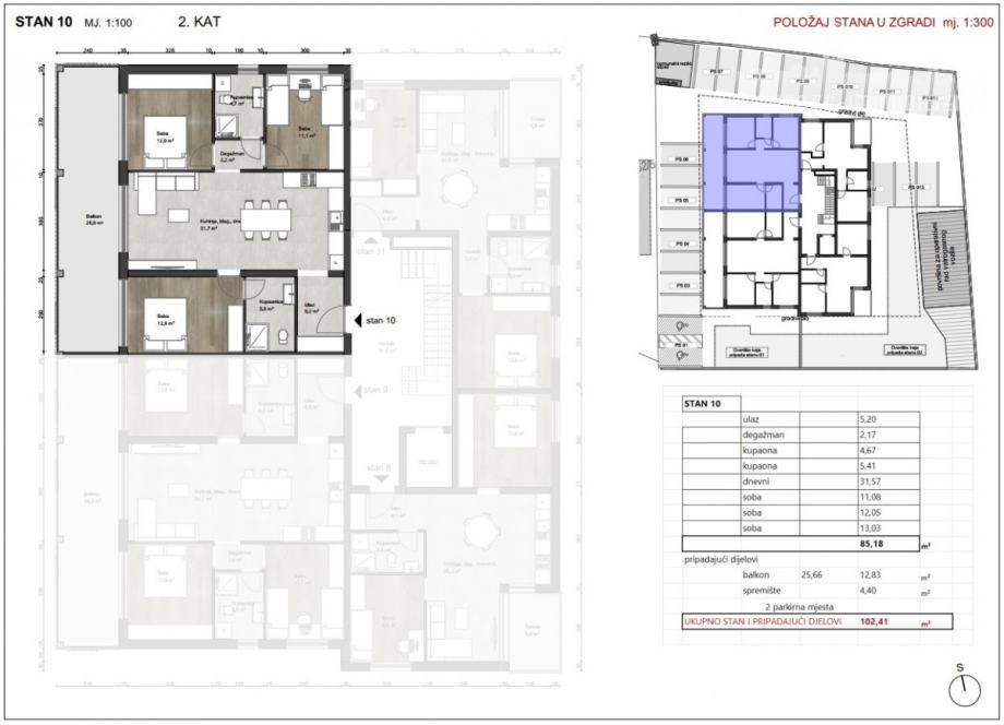 Stan 10 nalazi se na drugome katu i ima 98,01 m2 neto + spremište od 4,40 m2.
