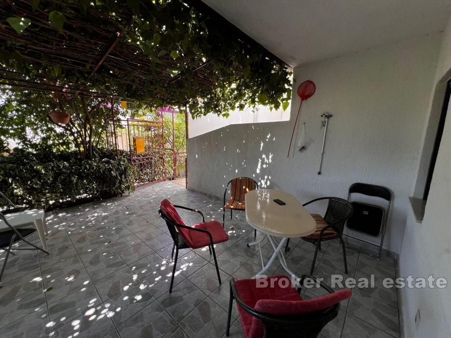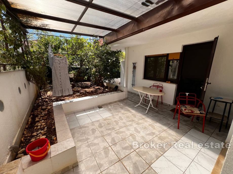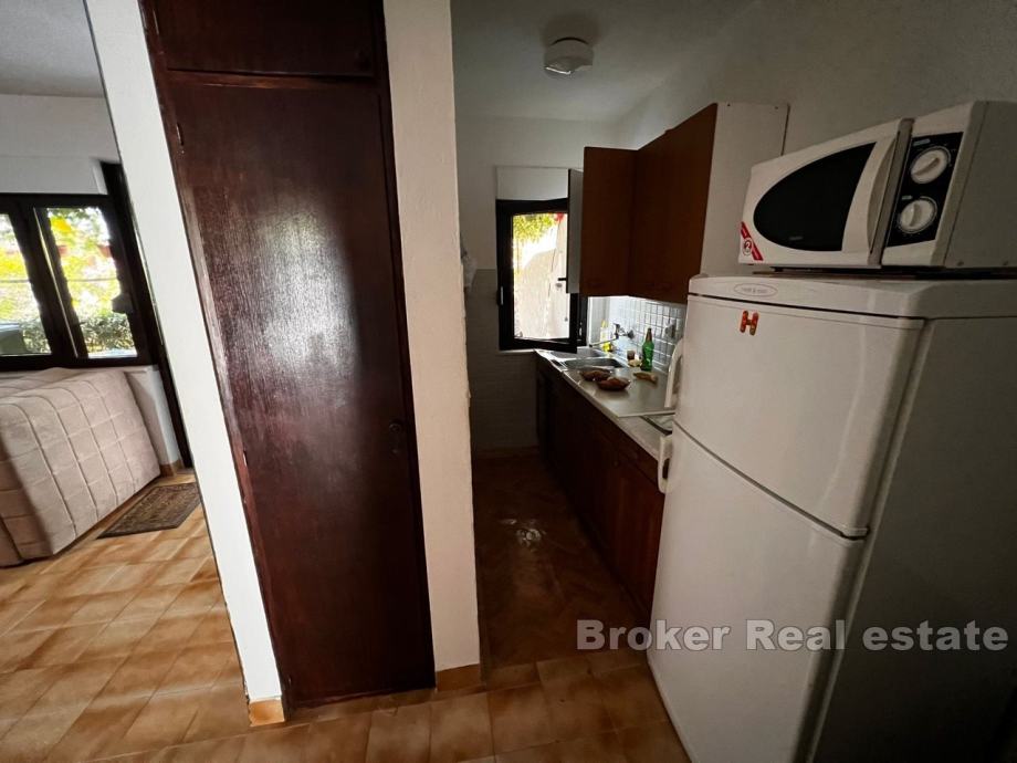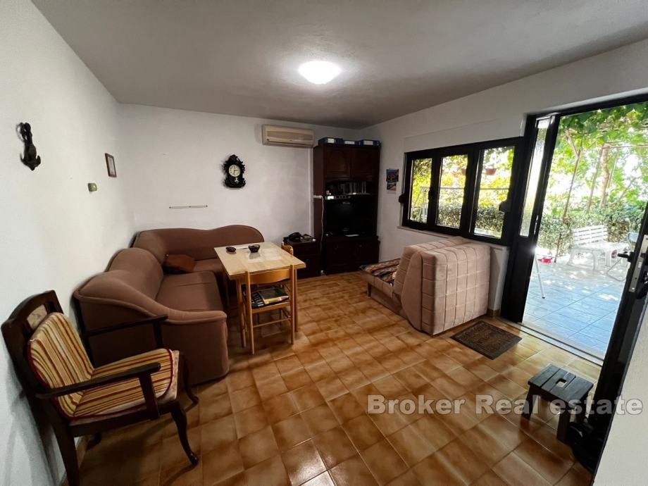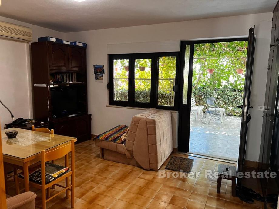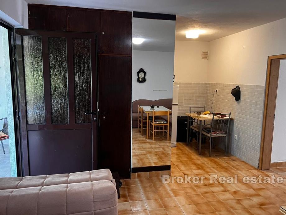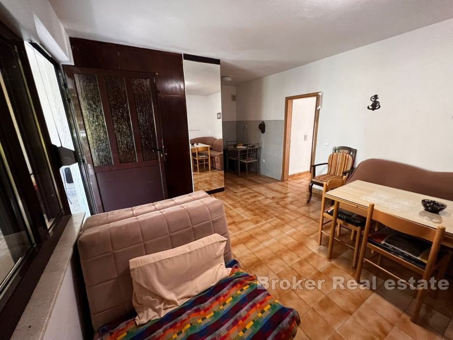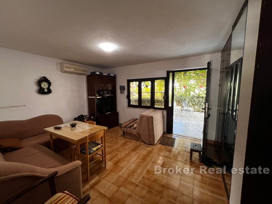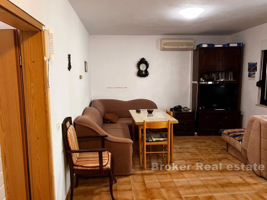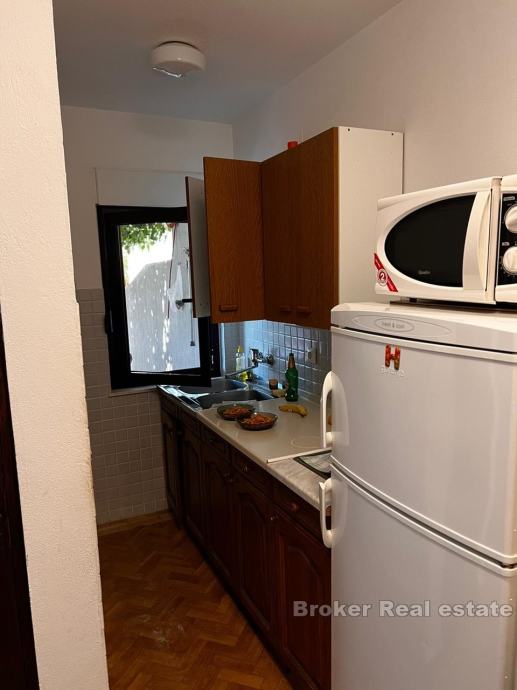 A one-bedroom apartment of 44 m² is available for long-term rent, located on the ground floor of a house in Okrug Gornji. The apartment consists of one bedroom, a living room with a dining area, and a small, functional kitchen.