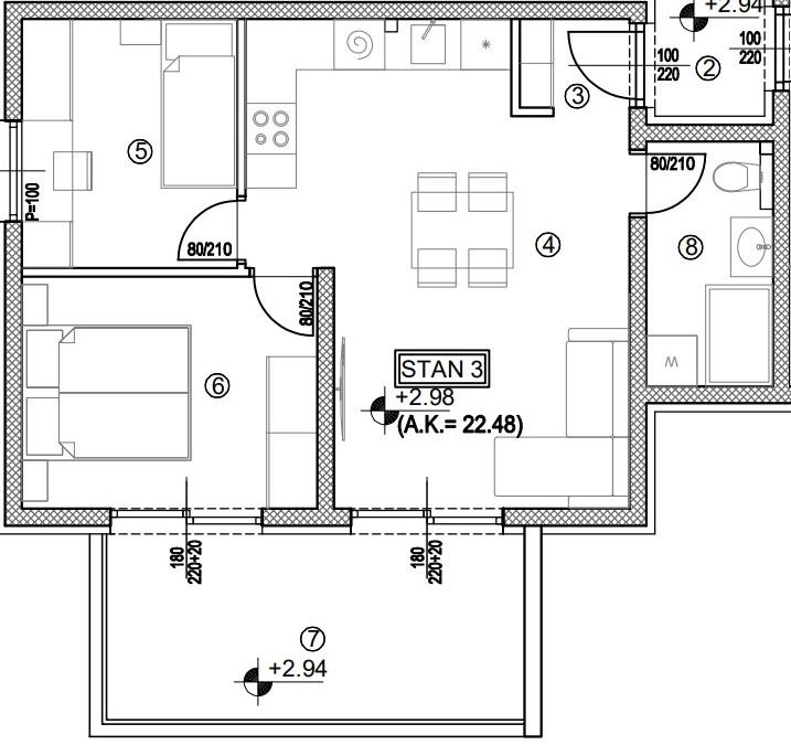 Sastoji se od hodnika, dvije spavaće sobe, kupaonice, predsoblja, kuhinje s blagovaonicom i dnevnim boravkom balkona.
