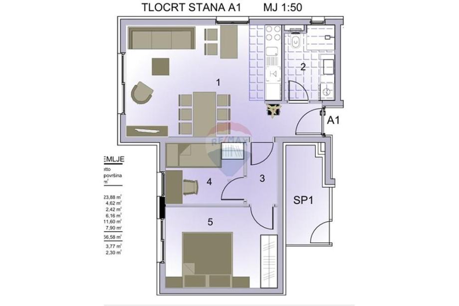 Stan A1 je u prizemlju i ukupna kvadratura s vrtom iznosi 127,68m2.