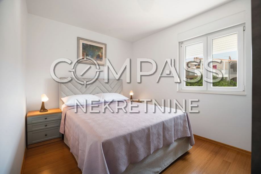 Повністю мебльована квартира для довгострокової оренди, підходить для працівників або довгого проживання. 63 м², для 4 осіб, обладнана кухнею, ванною, пральною машиною, кондиціонером, інтернет включено. Загальний басейн та мангал. 200 м від моря, тиха локація з парковкою. Контакт: +385 91 638 1492, leana@compass.hr