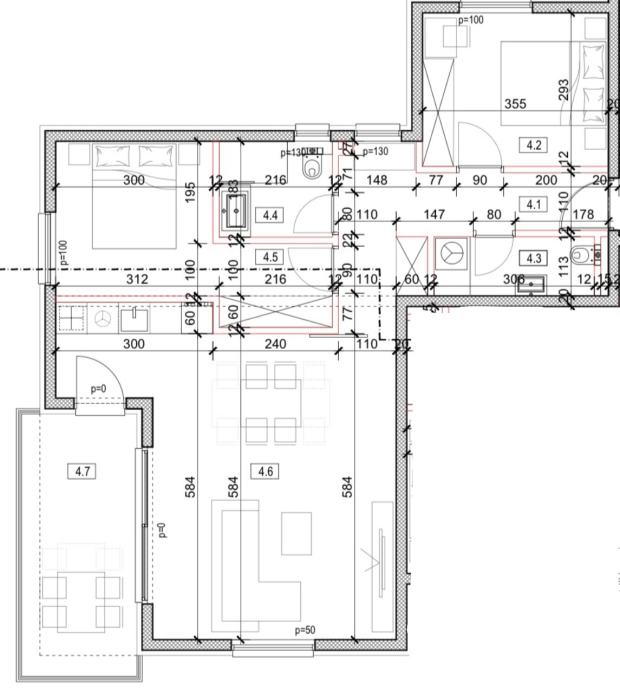 Apartment S4 consists of a hallway, two separate bedrooms, a bathroom with a toilet, a toilet, a kitchen with a living room and a dining room with an exit to the terrace.