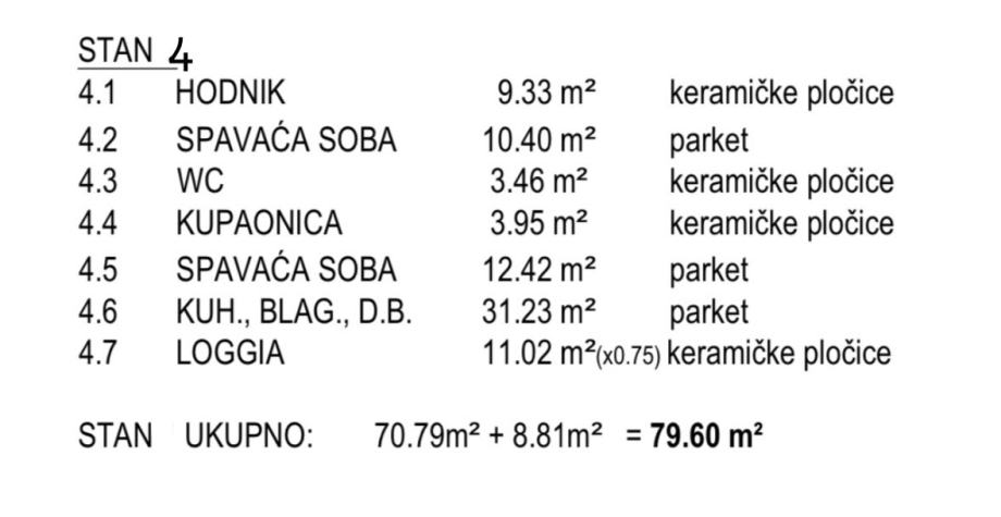 Stan S4 se sastoji od hodnika, dvije odvojene spavaće sobe, kupaonice sa wc-om, wc-a, kuhinje sa dnevnim boravkom i blagovaonicom sa izlazom na terasu.