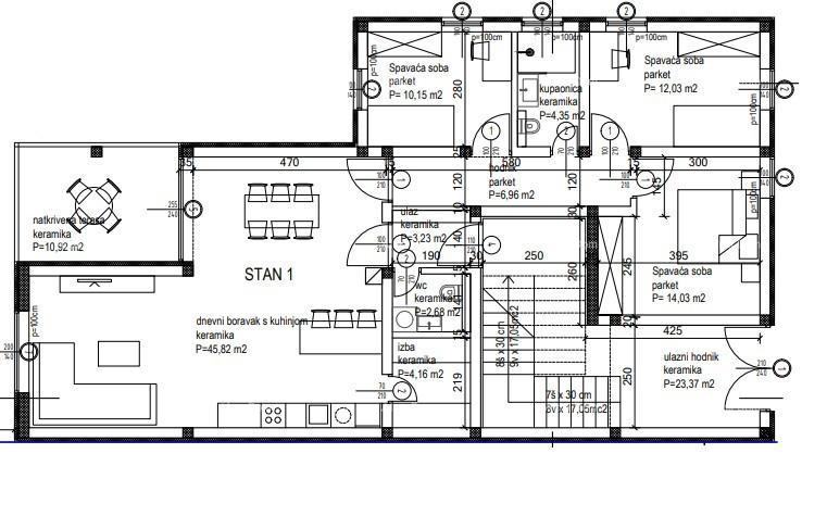 dnevni boravak +kuhinja + blagavaona - 45.82 m2