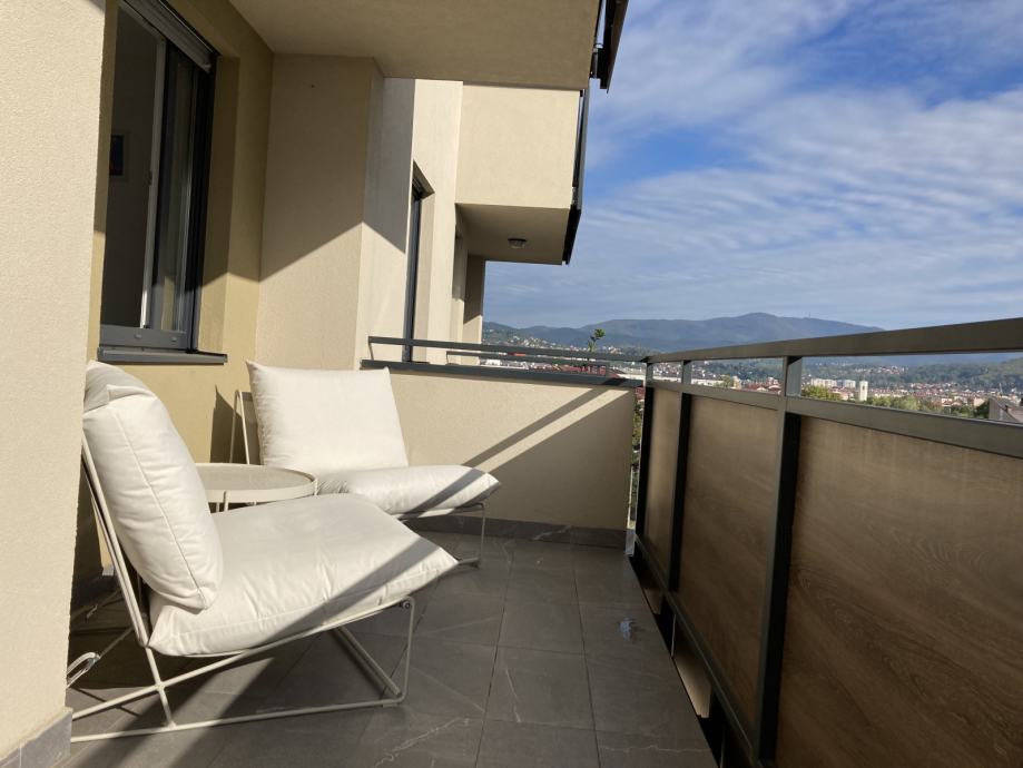 Izlaz iz dnevnog boravka je na prostrani balkon / lođu s koje se pruža neometani pogled na Medvednicu i Sljeme.
