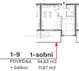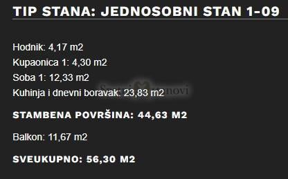 Stan se sastoji od ulaznog hodnika, dnevnog boravka s kuhinjom i blagovaonom, spavaće sobe i kupaone (44,63 m2). Iz dnevnog boravka se izlazi na balkon od 11,07 m2.