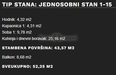 Stan se sastoji od ulaznog hodnika, dnevnog boravka s kuhinjom i blagovaonom, spavaće sobe i kupaone (43,57 m2). Iz dnevnog boravka se izlazi na balkon od 8,68 m2.