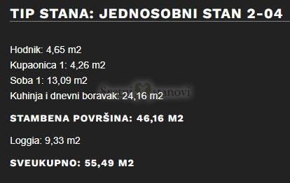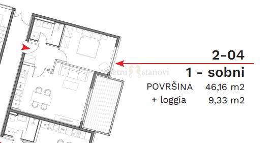 Stan se sastoji od ulaznog hodnika, dnevnog boravka s kuhinjom i blagovaonom, spavaće sobe i kupaone (46,04 m2). Iz dnevnog boravka se izlazi na loggiu od 10,01 m2.