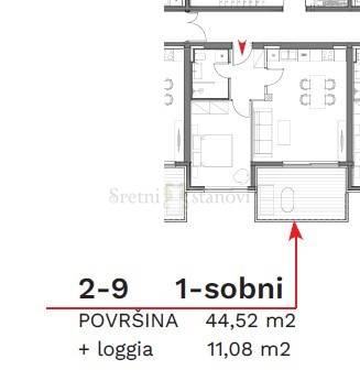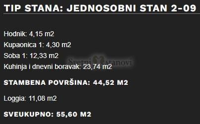 Stan se sastoji od ulaznog hodnika, dnevnog boravka s kuhinjom i blagovaonom, spavaće sobe i kupaone (44,52 m2). Iz dnevnog boravka se izlazi na loggiu od 11,08 m2.