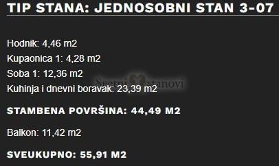 Stan se sastoji od ulaznog hodnika, dnevnog boravka s kuhinjom i blagovaonom, spavaće sobe i kupaone (44,49 m2). Iz dnevnog boravka se izlazi na balkon od 11,48 m2.