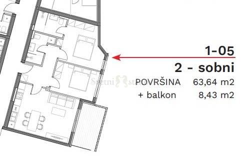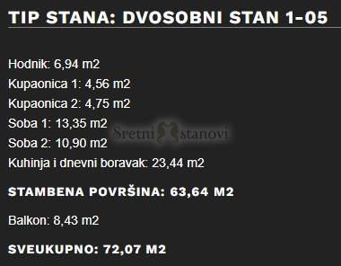 Stan se sastoji od ulaznog hodnika, dnevnog boravka s kuhinjom i blagovaonom, dvije spavaće sobe i dvije kupaone (63,64 m2). Iz dnevnog boravka se izlazi na balkon od 8,43 m2.