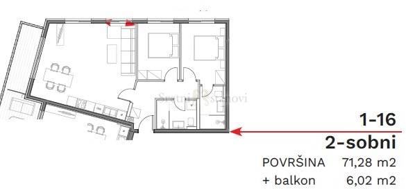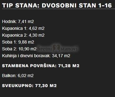 Stan se sastoji od ulaznog hodnika, dnevnog boravka s kuhinjom i blagovaonom, dvije spavaće sobe i kupaone (71,28 m2). Iz dnevnog boravka se izlazi na balkon od 6,02 m2.