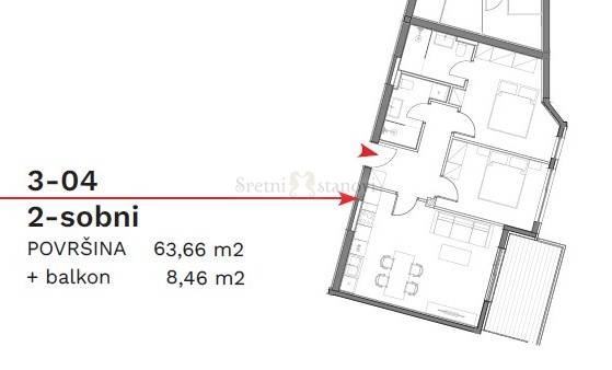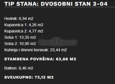 Stan se sastoji od ulaznog hodnika, dnevnog boravka s kuhinjom i blagovaonom, dvije spavaće sobe i kupaone (72,12 m2). Iz dnevnog boravka se izlazi na balkon od 8,46 m2.