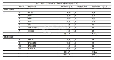 Na prodaju je moderan stan S2 u prizemlju Vile 2, kvalitetne novogradnje, neto površine 87,60 m², koji u potpunosti zadovoljava suvremene standarde stanovanja. Ova nekretnina predstavlja idealan izbor za kupce koji traže funkcionalan raspored, visoku kvalitetu gradnje i dodatnu vrijednost u obliku vlastitog vanjskog prostora.