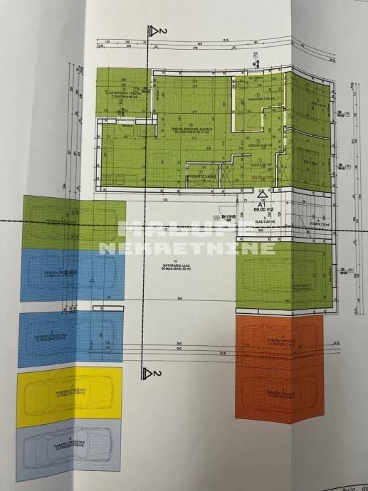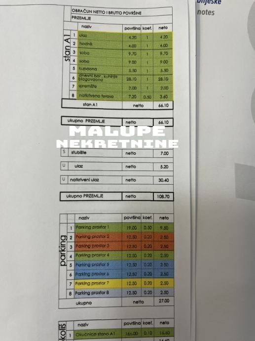 Stan u prizemlju veličine 66.10m2 se sastoji od hodnika, 2 spavaće sobe, dnevnog boravka,kuhinje i blagovaonice, spremišta i natkrivene terase sa izlazom u ograđenu okućnicu koja u cijelosti pripada tom stanu, te uključuje dva parkirna mjesta.