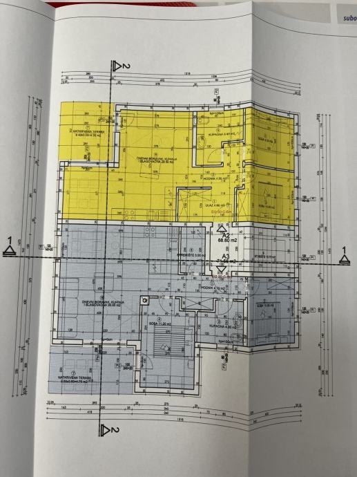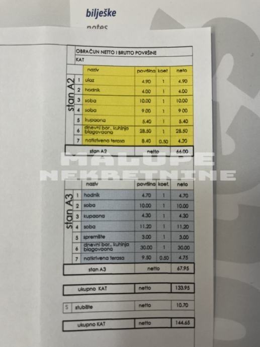 Dva stana na prvom katu su veličine 66m2 i 68m2 i sastoje se od: ulaza i hodnika, 2 spavaće sobe, dnevnog boravka, kuhinje i blagovaonice, spremišta i natkrivene terase, sa jednim parkirnim mjestom za svaki stan.