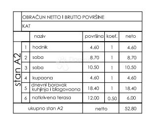 Stan ukupne netto površine 52,50 m² funkcionalnog je rasporeda te se sastoji od dnevnog boravka s kuhinjom i blagovaonicom, 2 spavaće sobe, kupaonice, hodnika i natkrivene terase koja pruža dodatni komfor i prostor za opuštanje tijekom cijele godine.