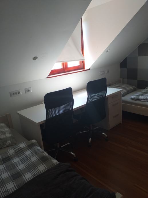 Dvokrevetni apartman, moderno opremljeno sa zasebnim kupatilom i sanitarnim čvorom te zajedničkim dnevnim boravkom i kuhinjom (kompletno namješteno). Udaljenost 7 min od centra grada na adresi Janka Leskovara 9, Varaždin. Osiguran vlastiti parking za potrebe stanara.