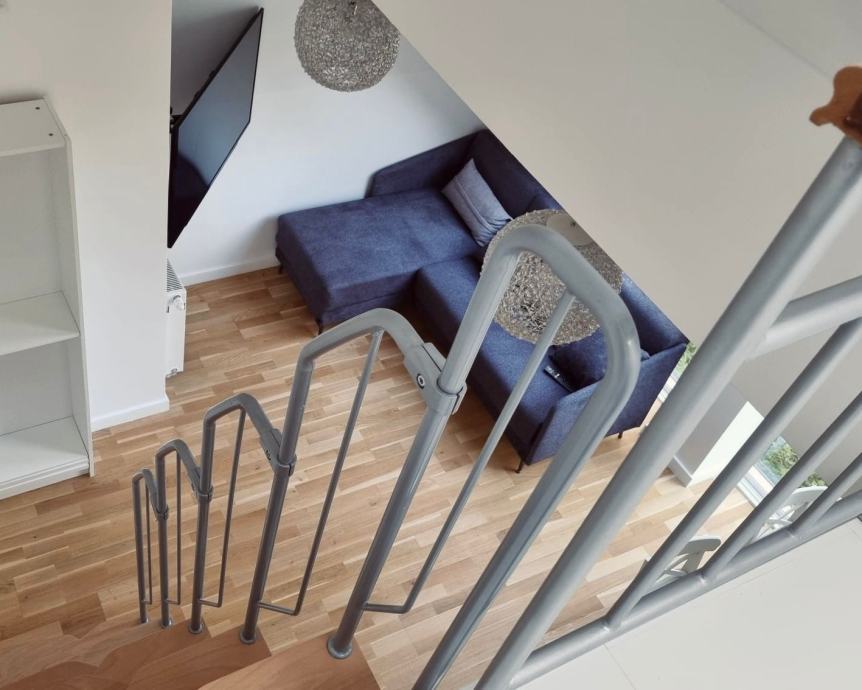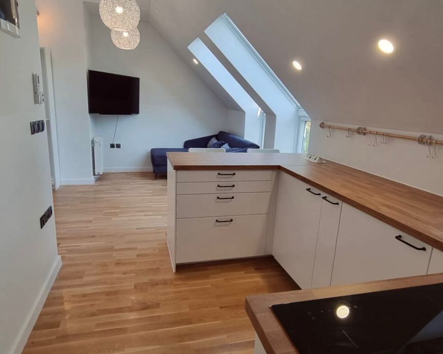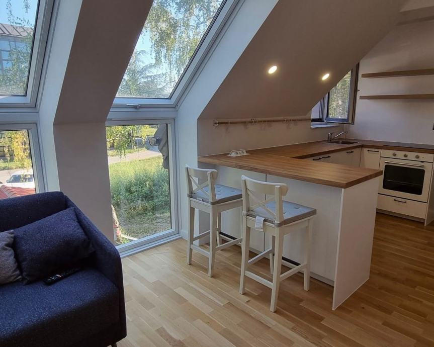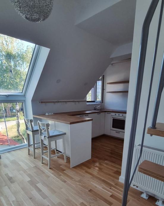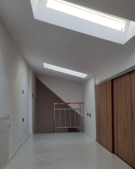 - ukupno 47m2 podne površine, ali budući da je dvoetažni i u potkrovlju, po koeficijentu je 34m2 neto površine.