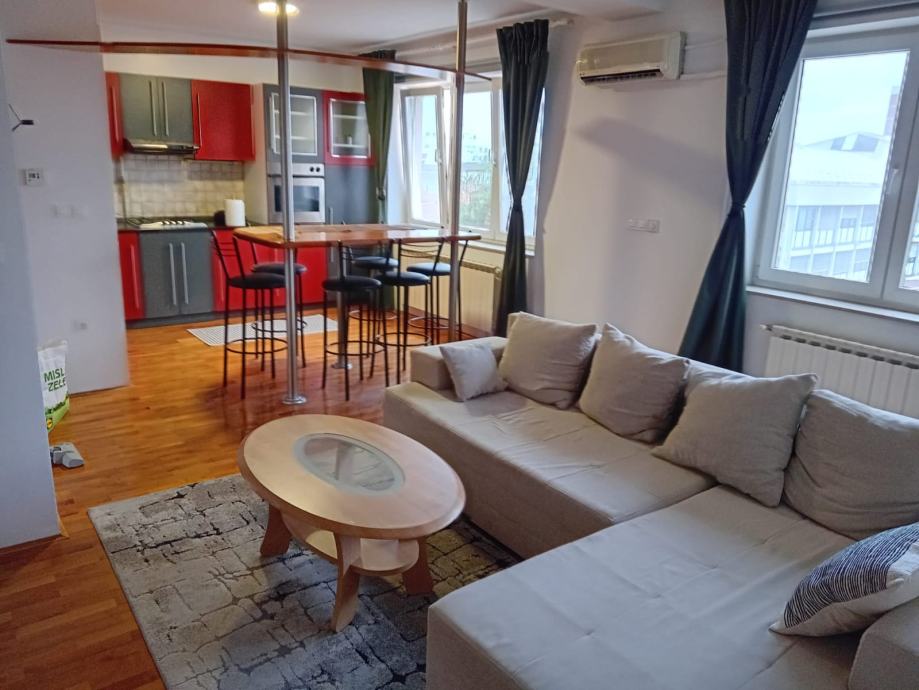 Iznajmljujem stan na trecem katu stambene zgrade bez lifta u centru grada (Ul. Andrije Kacica Miosica) koji se sastoji od ulaznog hodnika s garderobnim ormarom, spavace sobe, kupaonice s kadom te open-concept prostora s dnevnim boravkom, kuhinjom i blagavaonicom. Stan je dvostrano orijentiran, s puno dnevnog svjetla, kompletno namjesten i opremljen (klima uredaj, TV internet, perilica posuda, hladnjak, manja skrinja za zamrzavanje, pecnica, stednjak na plin i struju, perilica rublja). Grijanje je centralno, plinsko, etazirano. Osigurano parkirno mjesto pod rampom. Obavezan ugovor o najmu i polog u iznosu jedne mjesecne najamnine. Rezije nisu ukljucene u cijenu mjesecnog najma.