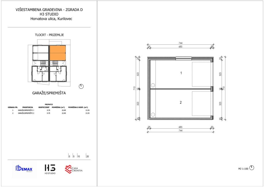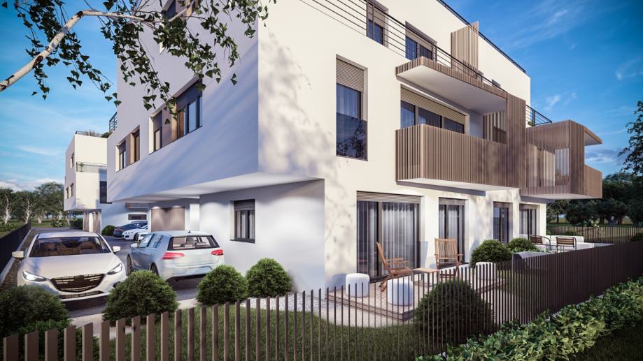 Kupcima na raspolaganju stoje vanjska nenatkrivena parkirna mjesta (12,50 m2 tlocrtno) po 10.000 EUR te garaže sa spremištima (23 m2 tlocrtno) po 45.000 EUR.