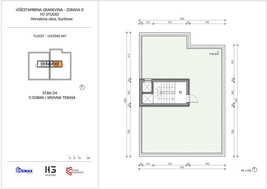 Prodaje se četverosobni penthouse D4 u Horvatovoj ulici u Velikoj Gorici u projektu u izgradnji na 2. katu druge zgrade (gledano s ceste), orijentiran je prema sjeveru, jugu i istoku i ima 121,40 m2.