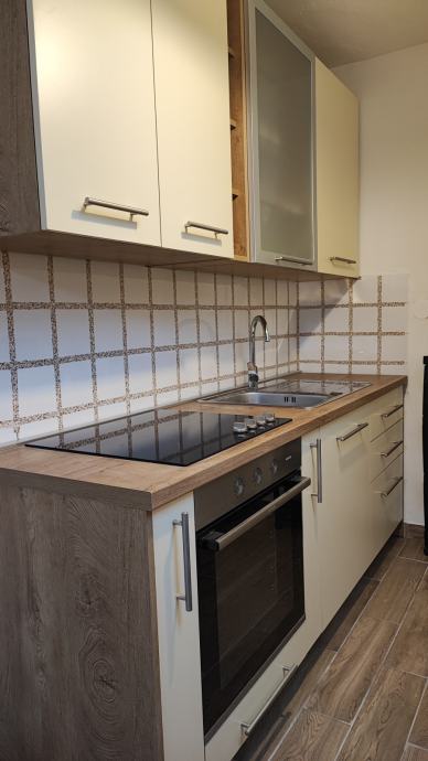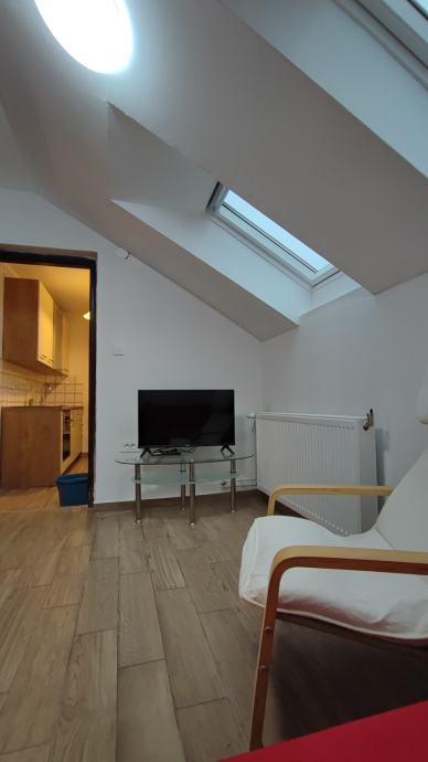 Iznajmljuje se stan u potkrovlju koji se sastoji od veće i manje sobe, kuhinje opremljene novom indukcijskom pločom i pećnicom, novom kupaonicom, novom perilicom rublja te ulaznog hodnika.