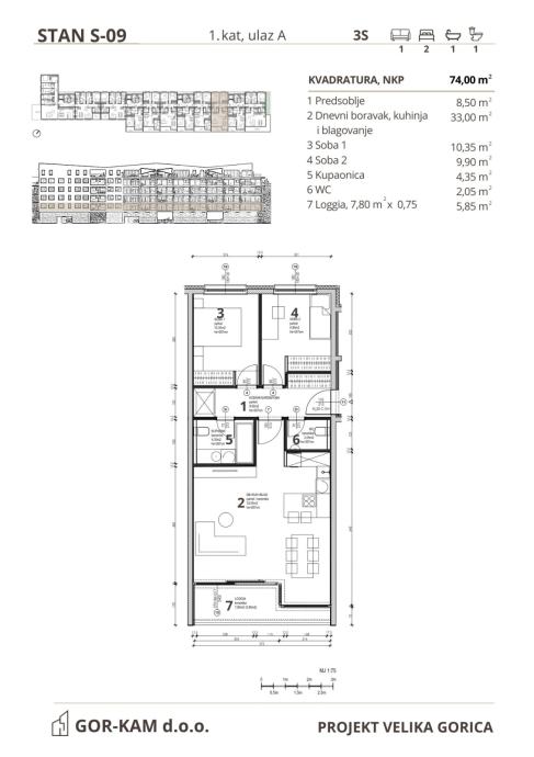 Ovaj predivan osunčani stan nalazi u novogradnji u Velikoj Gorici te je dostupan na različitim etažama. Osim ovog (tlocrta) stana, u ponudi različite stanove od cca 73-75m2 na raznim katovima, a koje možete vidjeti u tlocrtima.
