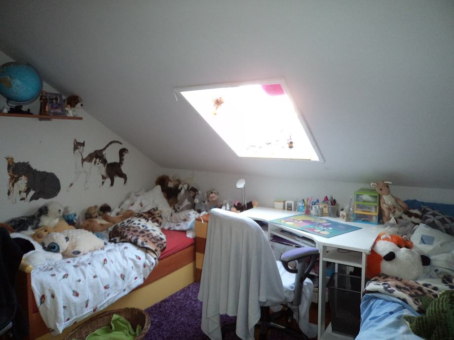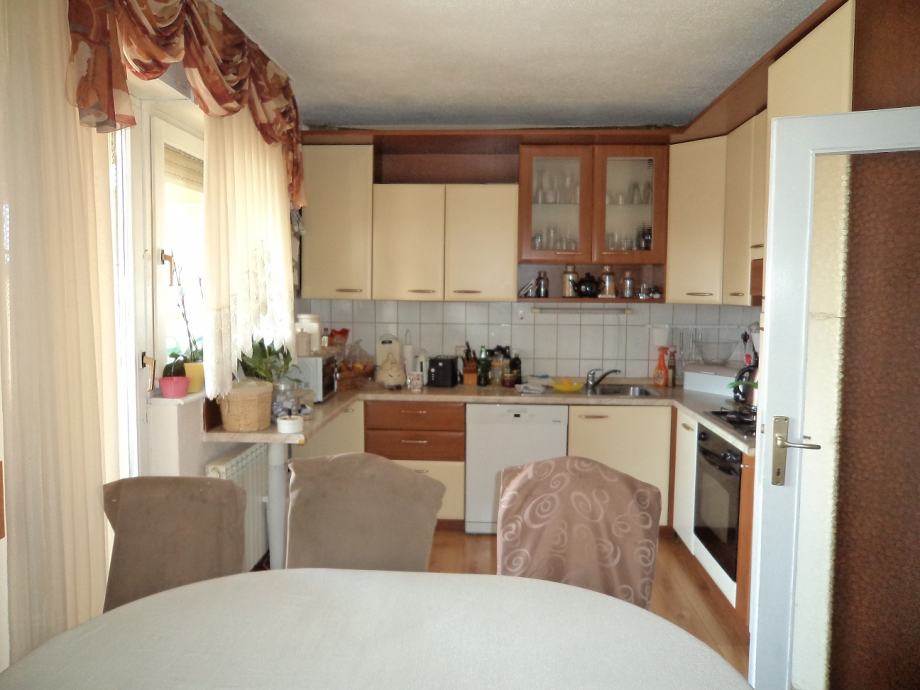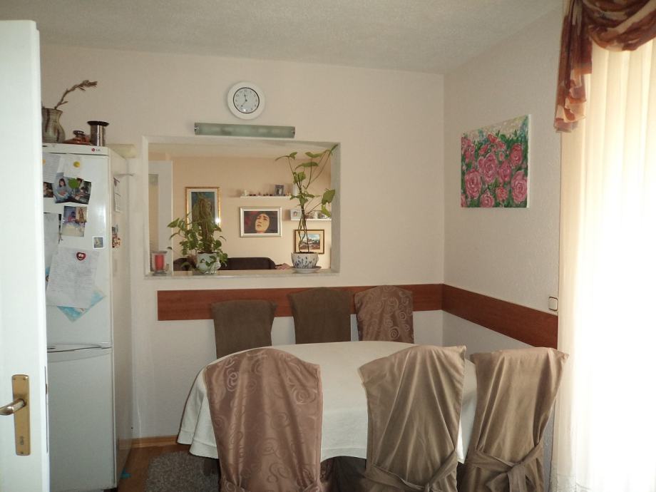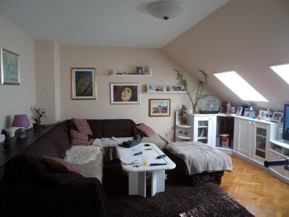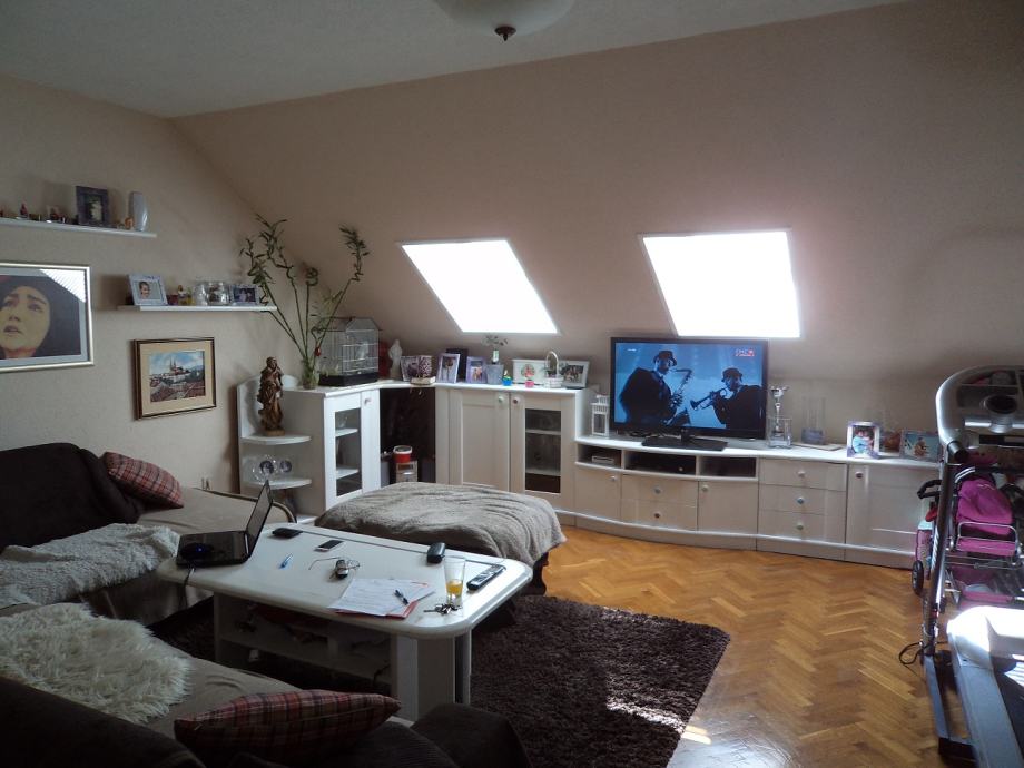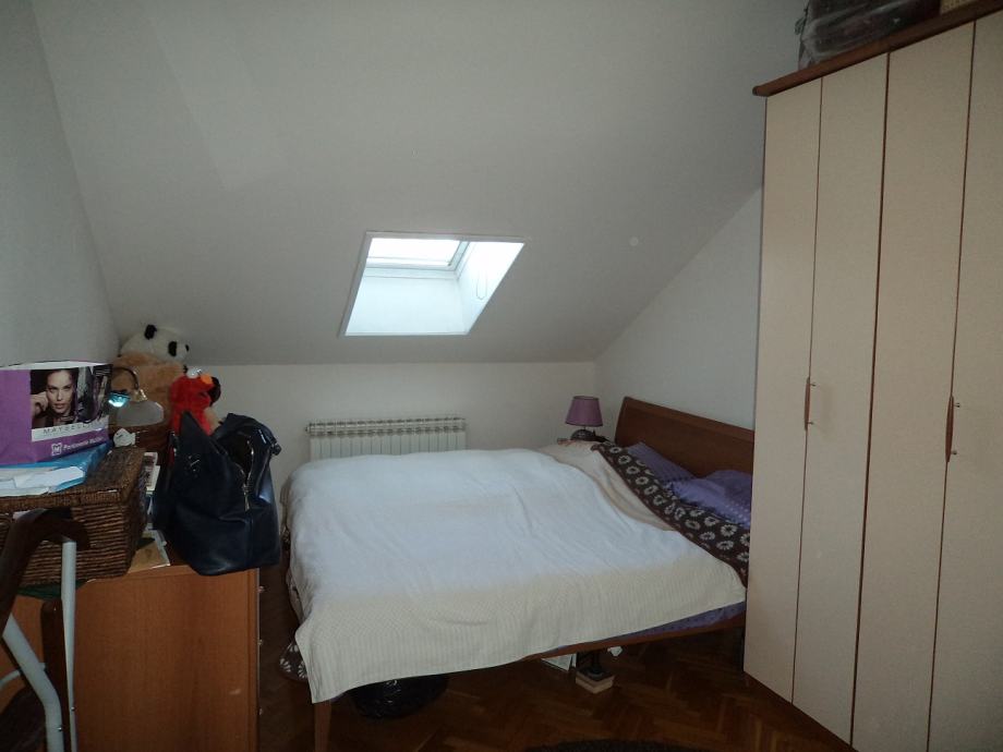 Stan površine 77 m2 na 3.katu (potkovlje) trokatnice.Sastoji se od:ulaznog hodnika, kuhinje sa blagovaonicom sa izlazom na balkon,d.boravka,dvije spavaće sobe i kupaonice. Stanu pripada i spremište u podrumu zgrade od 14,66 m2 i parking mjesto.