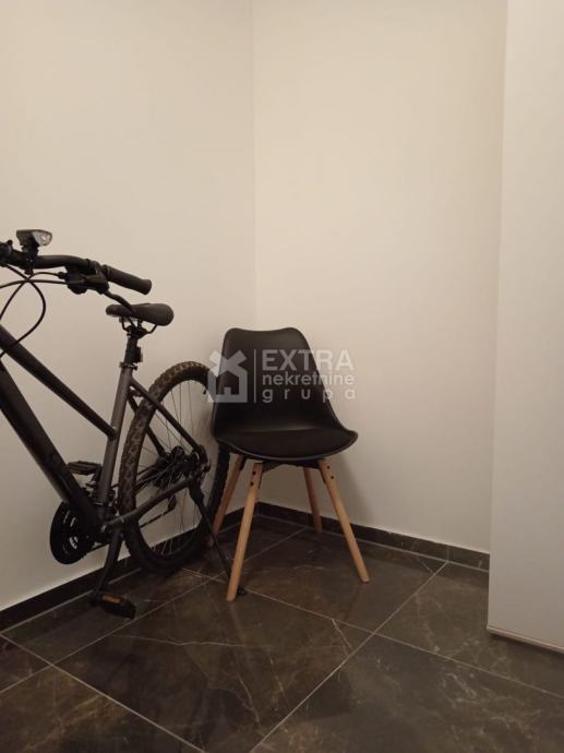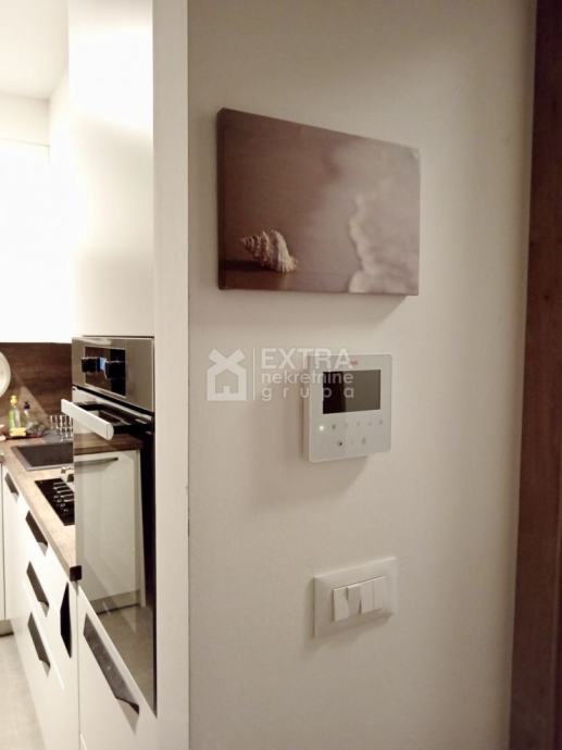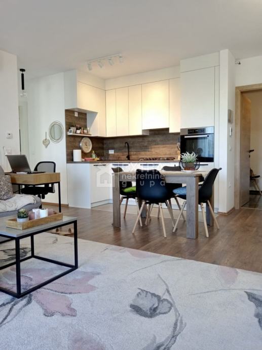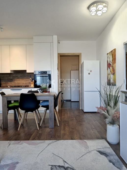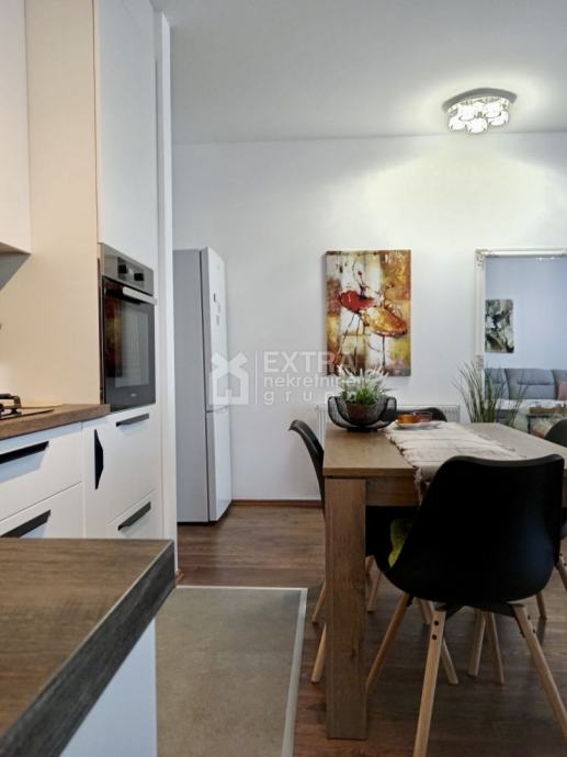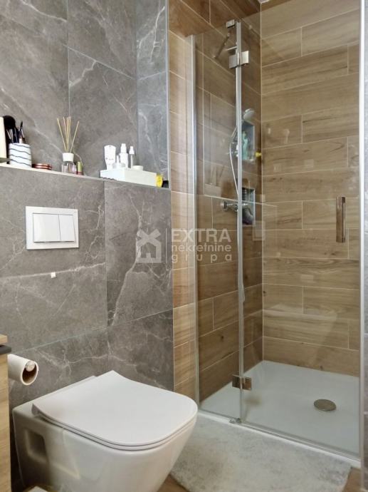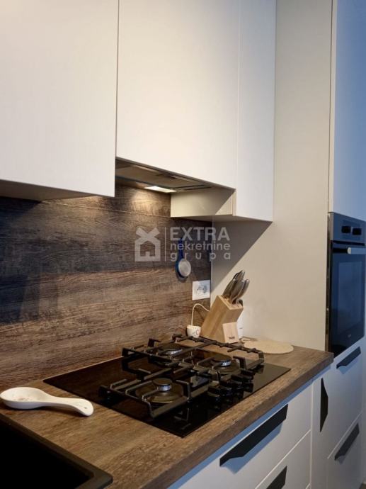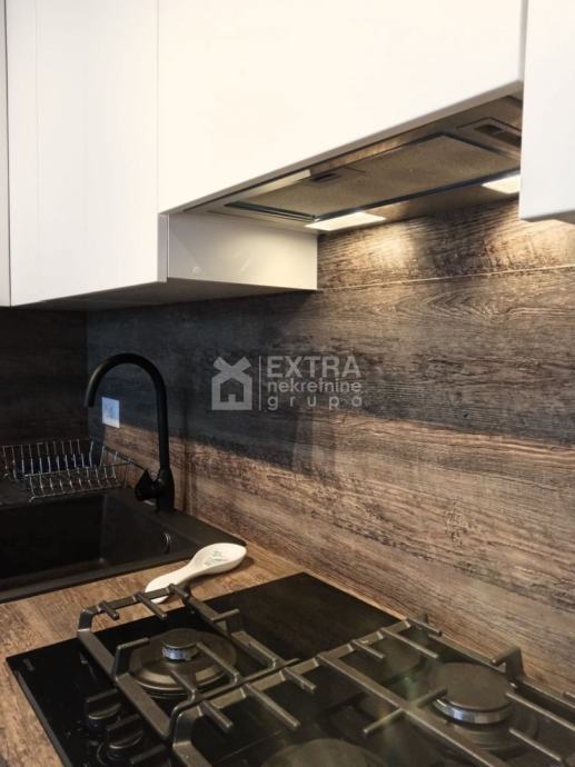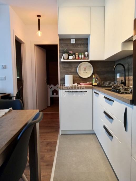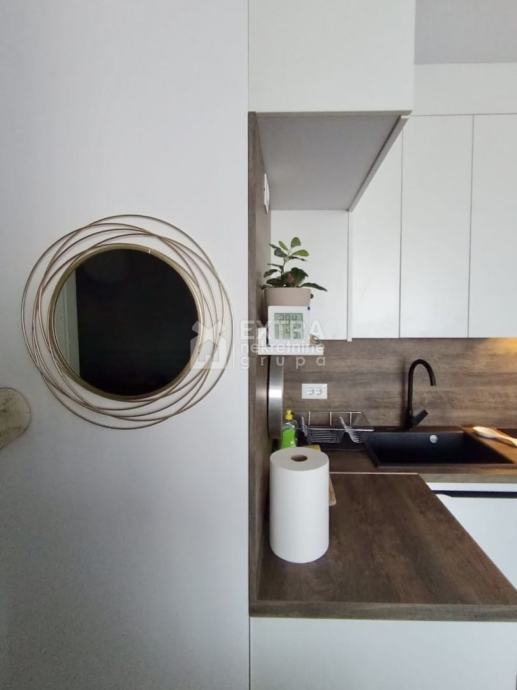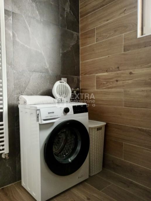 Stan se prodaje kompletno namješten. Moderno je uređen te opremljen kuhinjom sa svim potrebnim sadržajima poput perilice za suđe, kombinirane ploče za kuhanje na plin i struju te ugradbene nape. Kupaonica je opremljena modernim visećim elementom s nadgradnim umivaonikom, tuš kadom koja je smještena u niši te ugradbenim vodokotlićem. Perilica za rublje nalazi se unutar kupaonice.