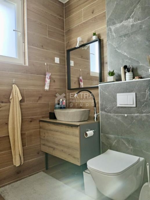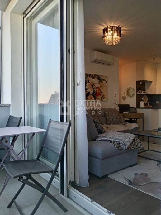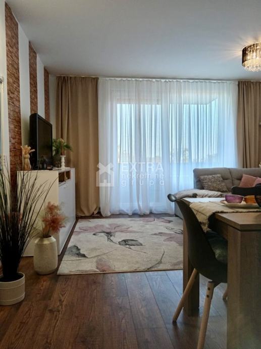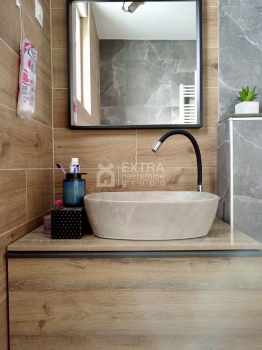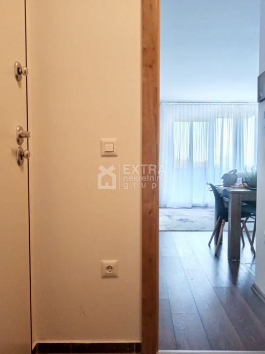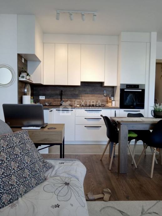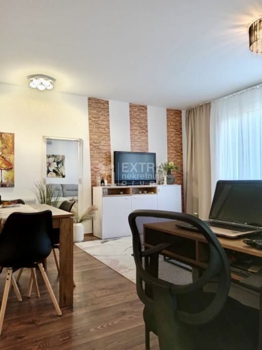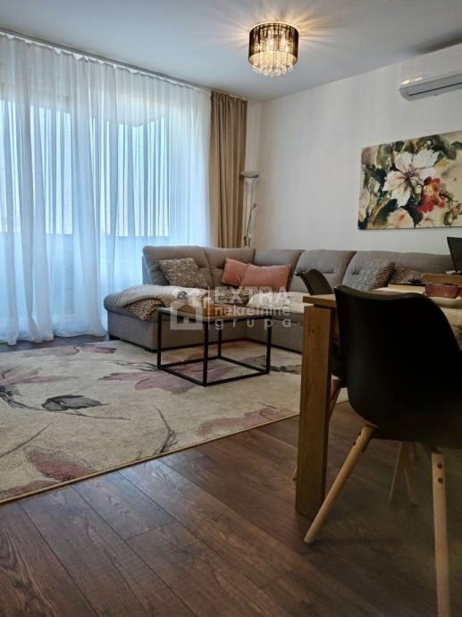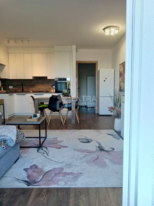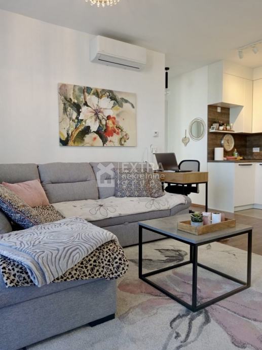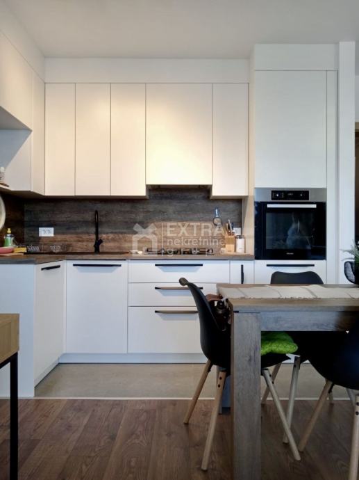 Stan se prodaje kompletno namješten. Moderno je uređen te opremljen kuhinjom sa svim potrebnim sadržajima poput perilice za suđe, kombinirane ploče za kuhanje na plin i struju te ugradbene nape. Kupaonica je opremljena modernim visećim elementom s nadgradnim umivaonikom, tuš kadom koja je smještena u niši te ugradbenim vodokotlićem. Perilica za rublje nalazi se unutar kupaonice.