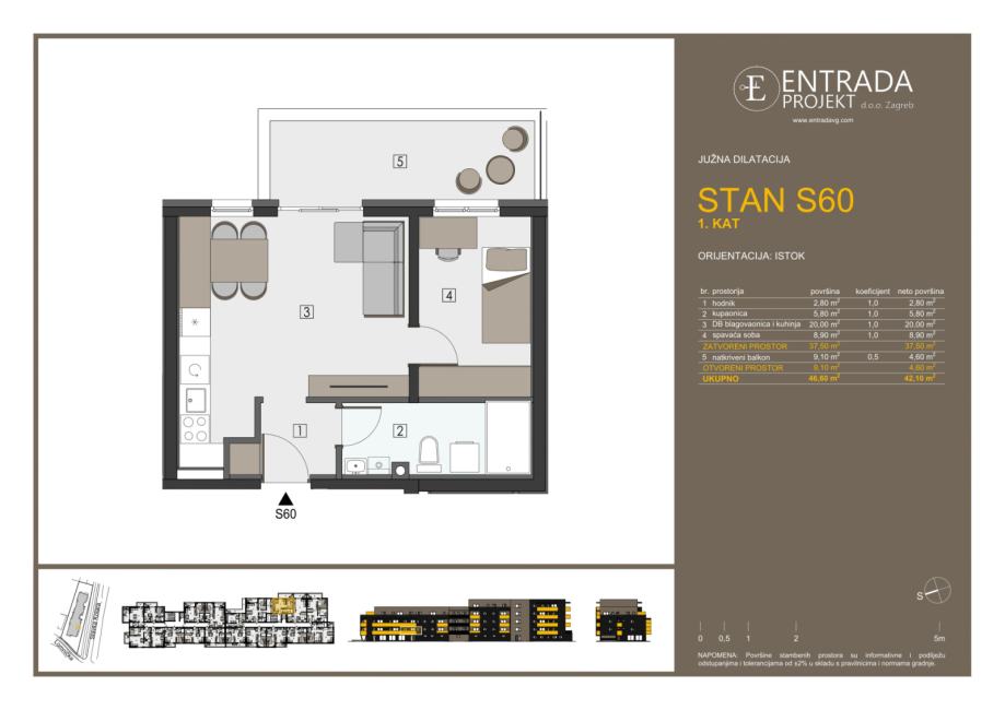 Prodaje se dvosoban stan S60 obračunske površine 42,10 m2 na 1. katu zgrade s dizalom u izgradnji s ukupno 61 stanom i 3 poslovna prostora, orijentiran prema istoku, a koji se sastoji od ulaznog hodnika, dnevnog boravka s kuhinjom i blagovaonicom, spavaće sobe, kupaonice s WC-om i natkrivenog balkona.