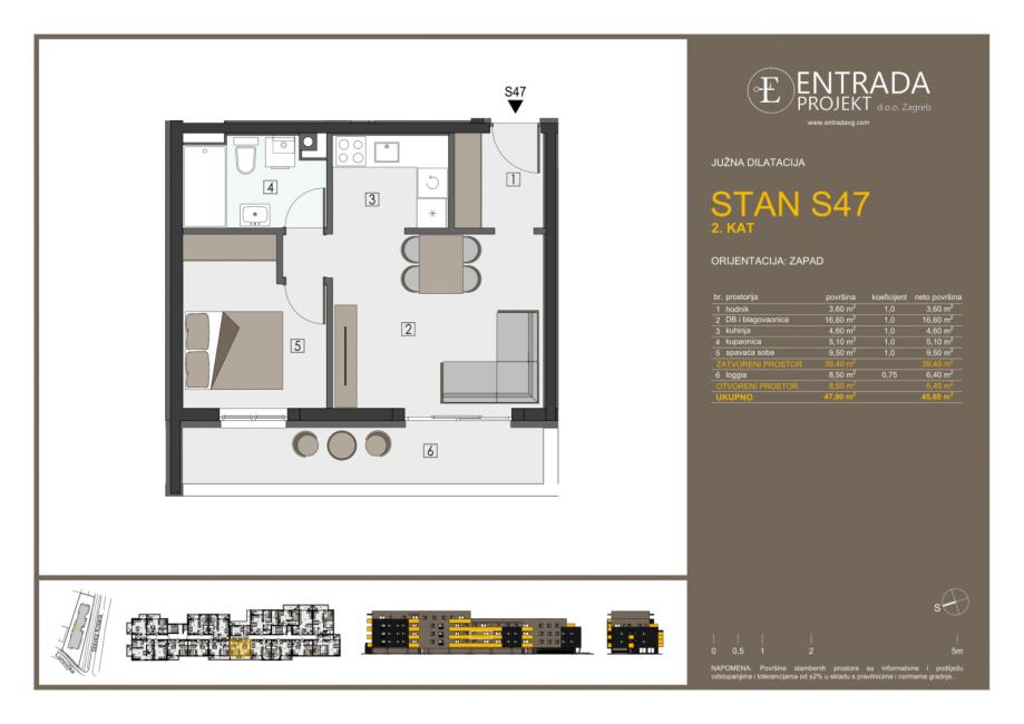 Prodaje se dvosoban stan S47 obračunske površine 45,80 m2 na 2. katu zgrade s dizalom u izgradnji s ukupno 61 stanom i 3 poslovna prostora, orijentiran prema zapadu, a koji se sastoji od ulaznog hodnika, dnevnog boravka s kuhinjom i blagovaonicom, spavaće sobe, kupaonice s WC-om i loggije.