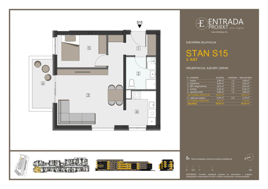 Prodaje se dvosoban stan S15 obračunske površine 55,30 m2 na 2. katu zgrade s dizalom u izgradnji s ukupno 61 stanom i 3 poslovna prostora, orijentiran prema sjeveru i zapadu, a koji se sastoji od ulaznog hodnika, dnevnog boravka s kuhinjom i blagovaonicom, spavaće sobe, kupaonice s WC-om i natkrivenog balkona.