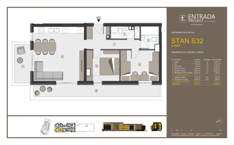 Prodaje se trosoban stan S32 obračunske površine 74,30 m2 na 4. (zadnjem) katu zgrade s dizalom u izgradnji s ukupno 61 stanom i 3 poslovna prostora, orijentiran prema sjeveru i zapadu, a koji se sastoji od ulaznog hodnika, dnevnog boravka s kuhinjom i blagovaonicom, dvije spavaće sobe, kupaonice s WC-om, WC-a, natkrivenog balkona i nenatkrivene terase.