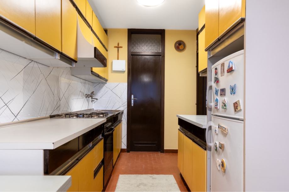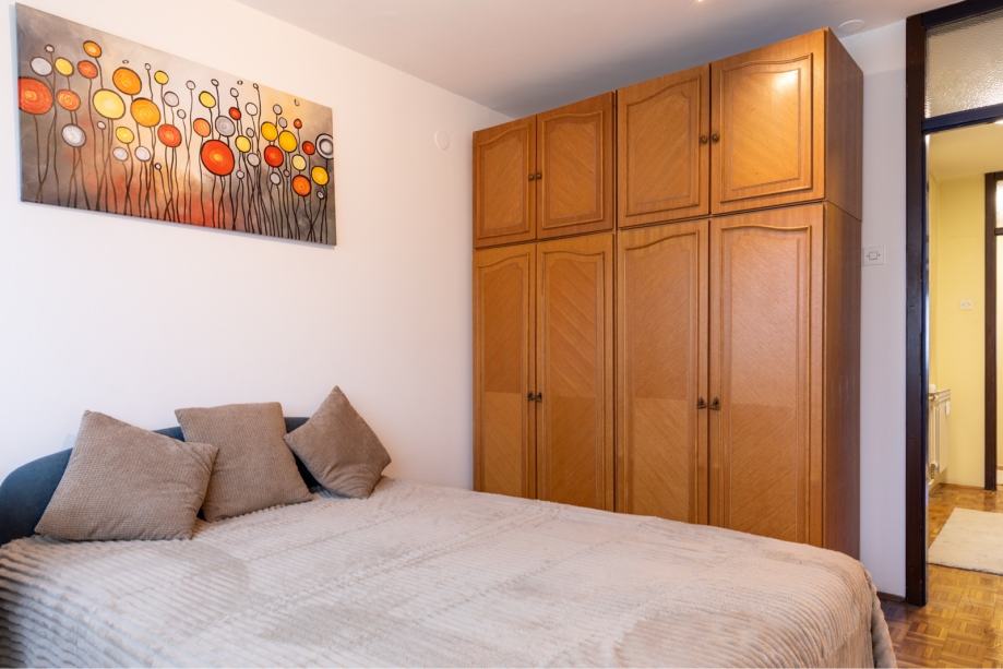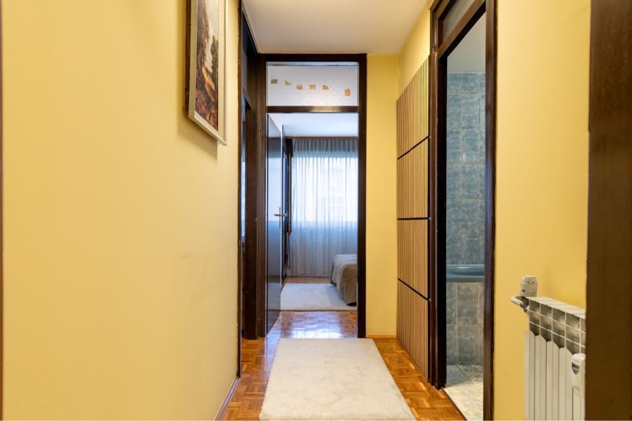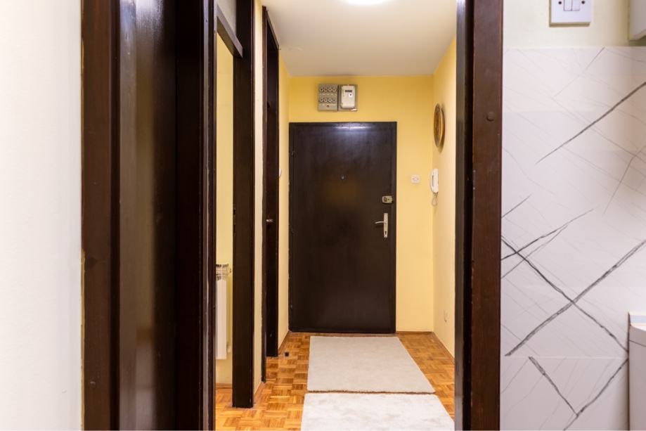Stan se sastoji od ulaznog hodnika, prostranog dnevnog boravka s izlazom na zatvoreni balkon, kuhinje s blagavaonicom koja se s malom preinakom moze povezati s dnevnim boravkom u jednu cjelinu, dva spremista, dvije spavace sobe, kupaonice i wc-a ta jos jednog zatvorenog balkona i hodnika. Stan je pun svjetla zbog svoje orjentacije