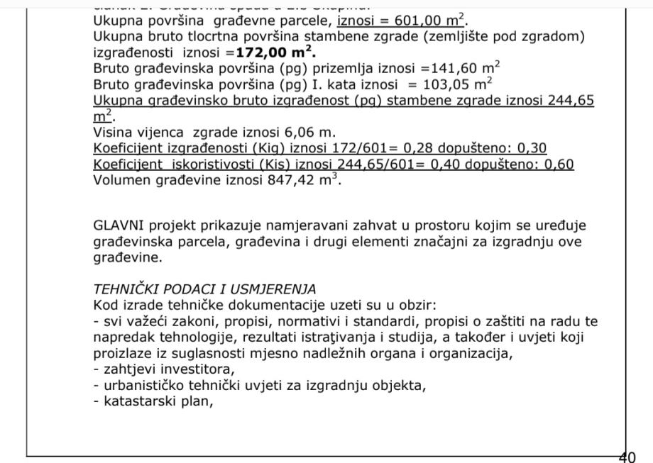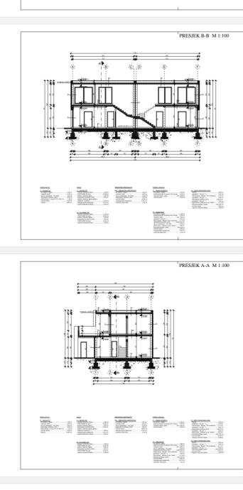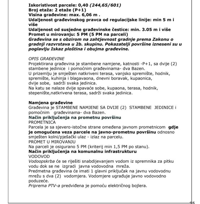 Projektirana građevina je stambene namjene, katnosti -P+1, sa dvije (2)stambene jedinice i pomoćnim građevinama- dva bazena.