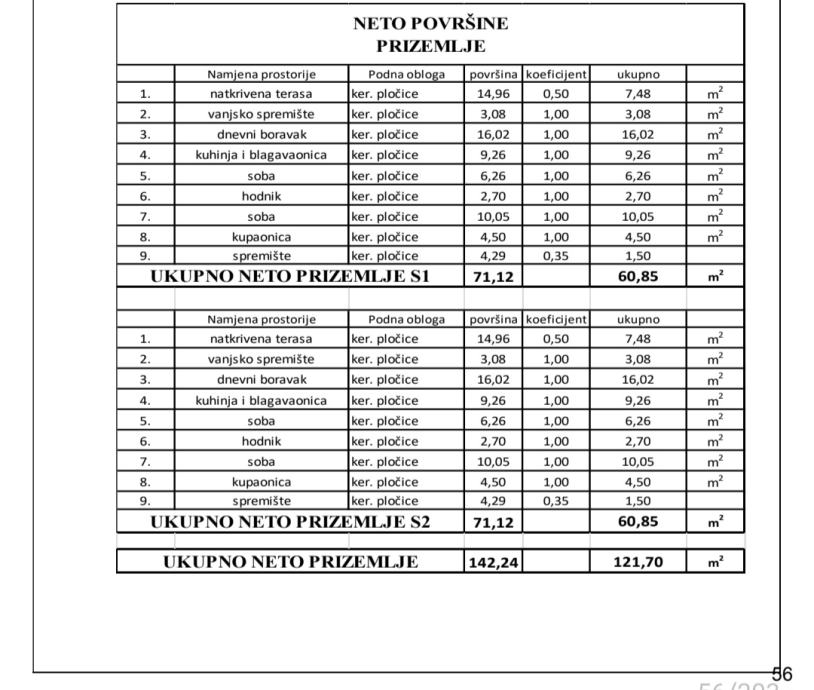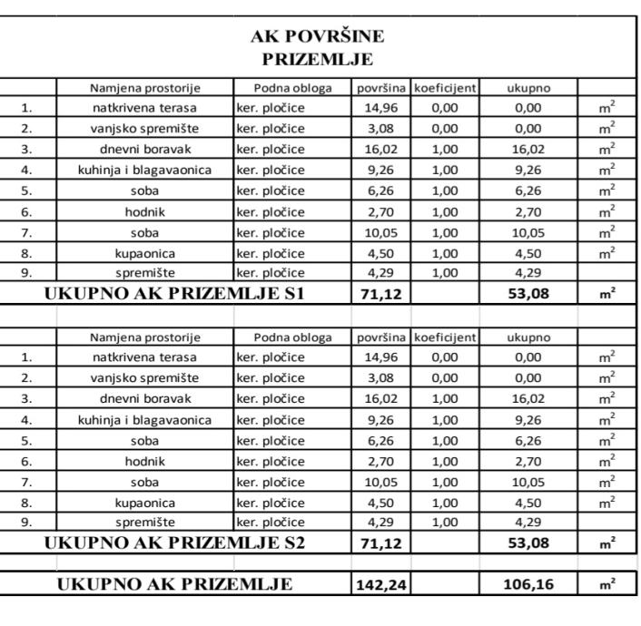U prizemlju je smještena natkriveni terasa, vanjsko spremište, hodnik,spremište, kuhinja i blagavaonica, dnevni boravak, kupaonica,dvije sobe, sadrži svaka jedinica.