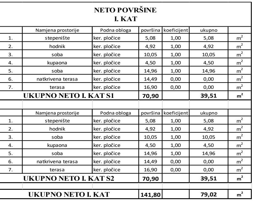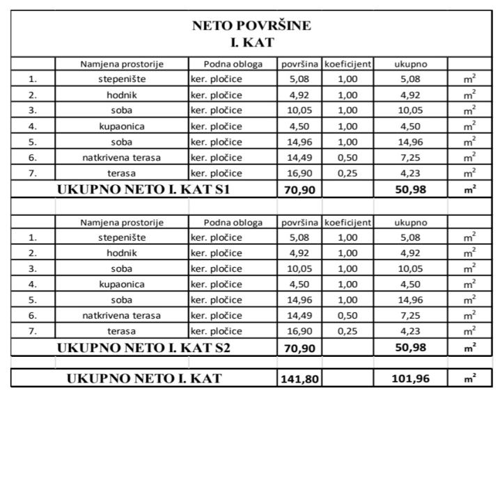 Na katu se nalaze dvije spavaće sobe, kupaonica, terasa, hodnik,stepenice,natkrivena terasa, sadrži svaka jedinica.