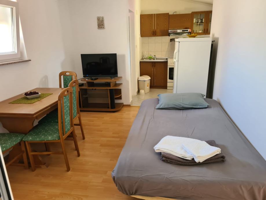 Stan se sastoji od spavaće sobe, dnevnog boravka s kuhinjom i kupaonice.
