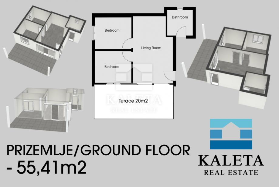 Apartman ima 55,41 m2 korisne površine, od čega 35,32 m2 zatvorenog prostora te 20 m2 natkrivene terase s pogledom na more.