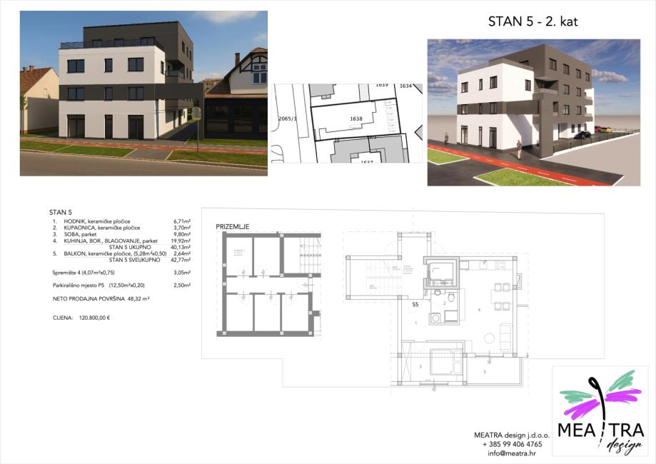 U kvalitetnoj novogradnji u ulici Tomaša Masaryka u Virovitici prodaje se moderan i funkcionalno projektiran stan na drugom katu stambene zgrade, ukupne prodajne površine 48,32 m², uz pripadajuće spremište i parkirališno mjesto.