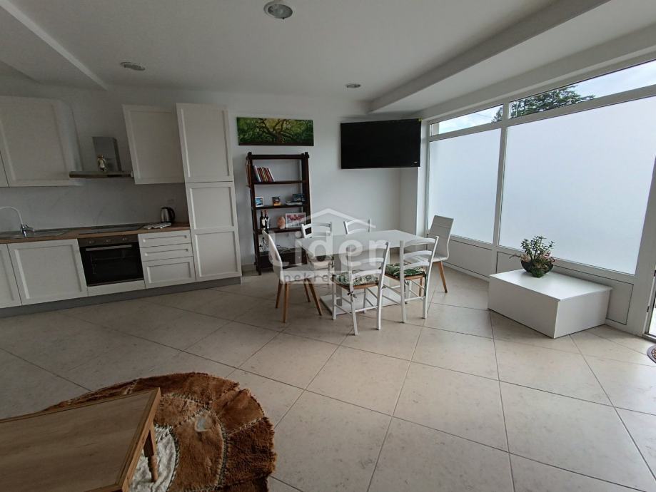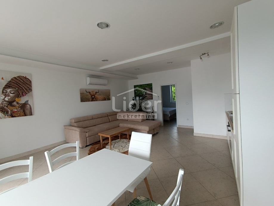 Viškovo, iznajmljuje se komforni jednosobni stan od 70m2, smješten u prizemlju. Sastoji se od kuhinje, velikog dnevnog boravka, sobe, kupaone i terase.
