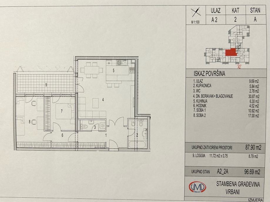 Vrbani, Domašinečka 4, Zagreb, VMD gradnja, 3-soban, 97 m2, 2. kat, 2011. Stan se sastoji od:
