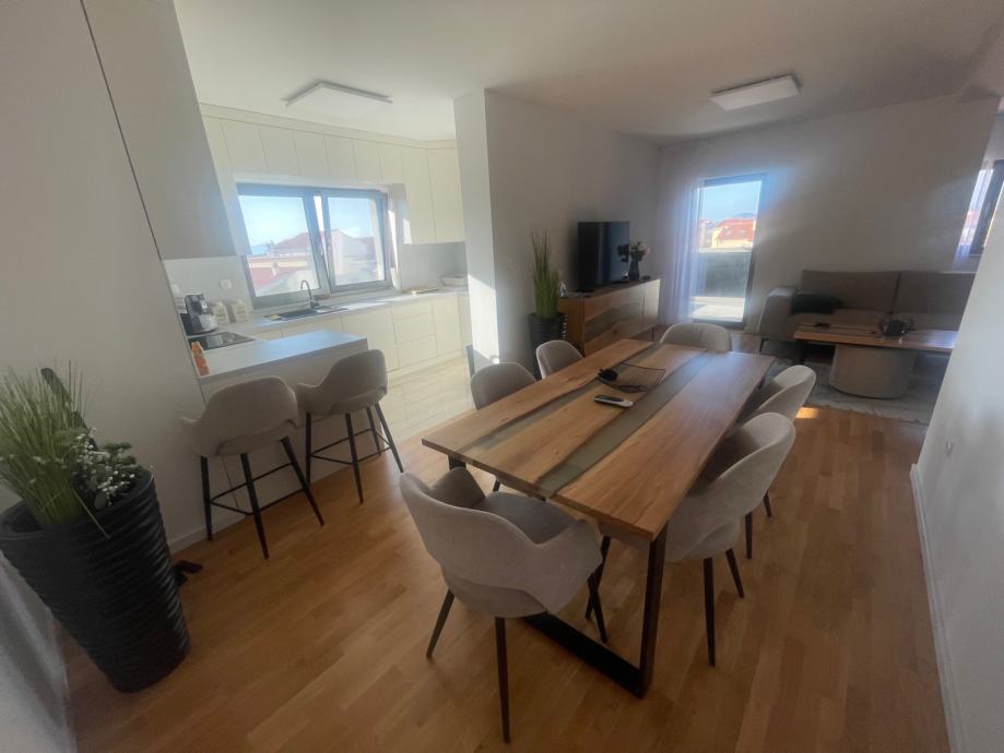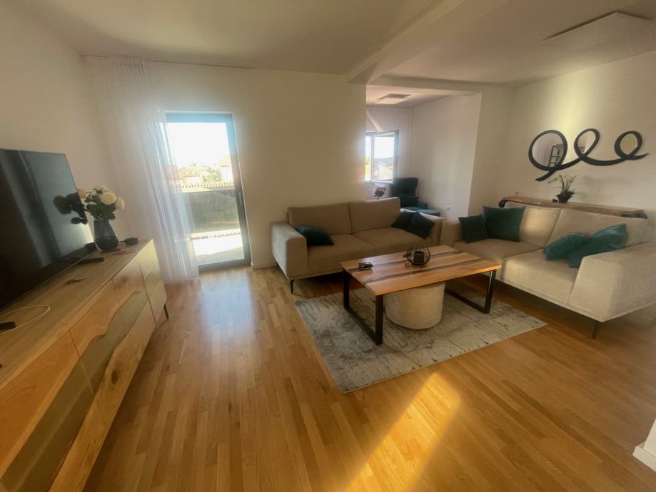 Top Stan na kompletnom drugom Katu.4 spavace sobe ,4 Balkona(jedna spav. Soba sa VCom i Tusom) svaka Soba sa nadkrivenim Balkonom.Ogroman dnevni Boravak sa Blagovaonom i Kuhinjom.Stan je podpuno namjesten i Klimatiziran sa dva parkirna Mjesta,te ostavom u prizemlju.U Stanu se nalazi i Büro koji je takodje namjesten.Zgrada je oblozena sa 20cm Stiropor Izolacijom-Stolarija Aluminijska sa Elek. Roletnama-Klimaks Stakla troslojna.Podovi od Hrastovog Parketa Itd.Lokacija 400m iza Hotela Olimpija Sky od Mora 600-700m ili 7-8 minuta do Plaze